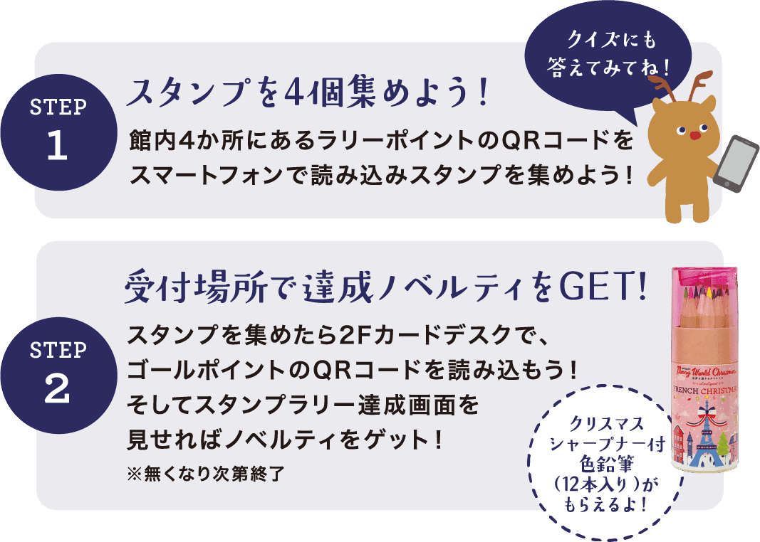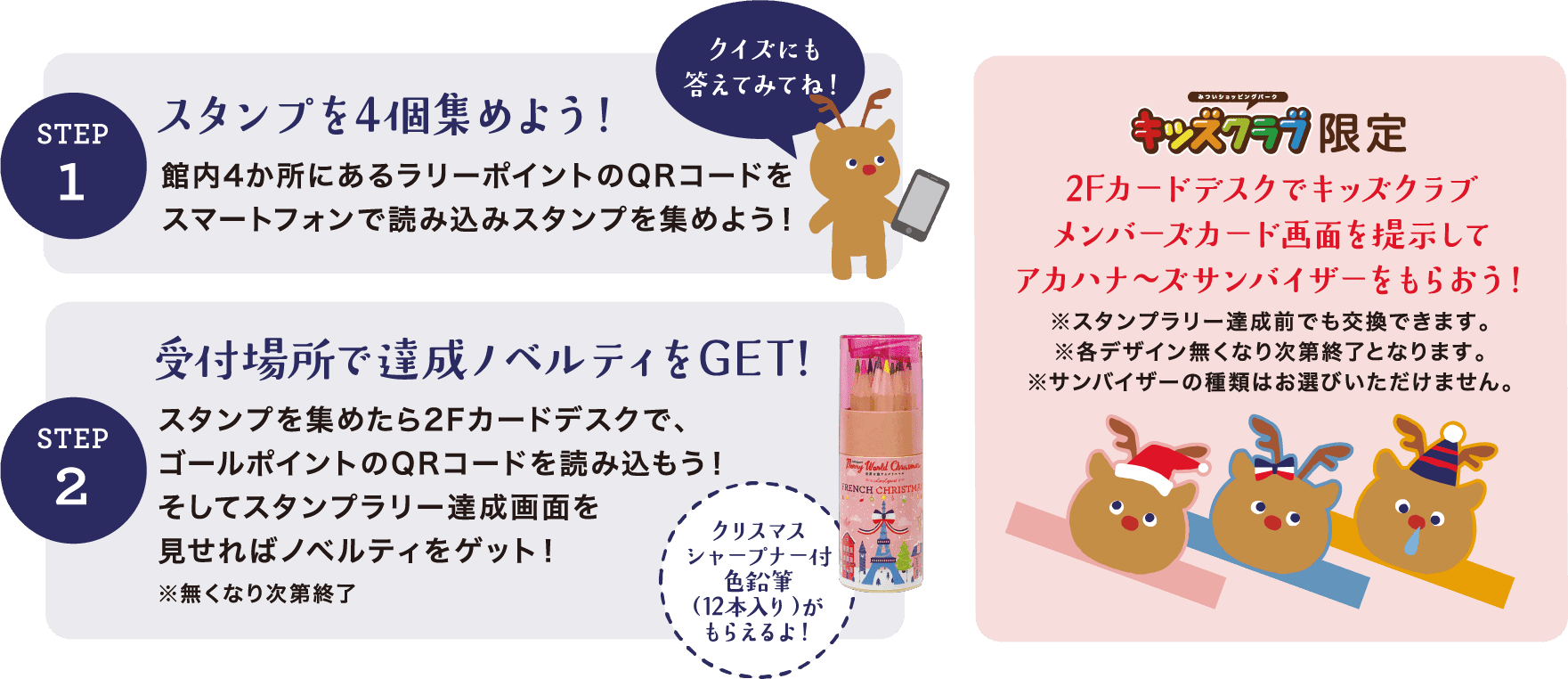※スタンプラリーには19:00以降も参加いただけますが、ノベルティの引き換えならびにサンバイザーのお渡しは19:00までとなります。※期間中であれば後日でもお引き換えいただけます。 ※QRコードは(株)デンソーウェーブの登録商標です。