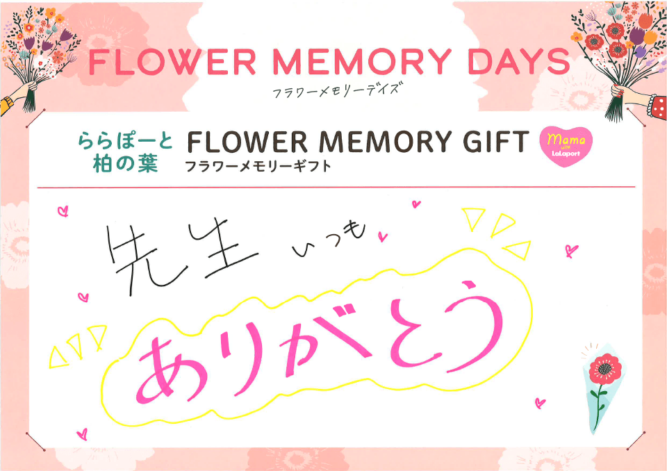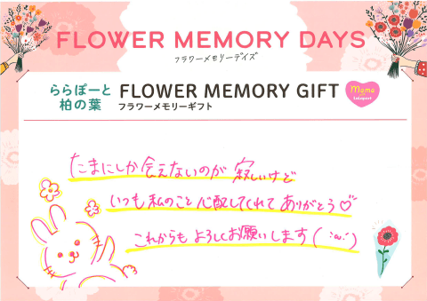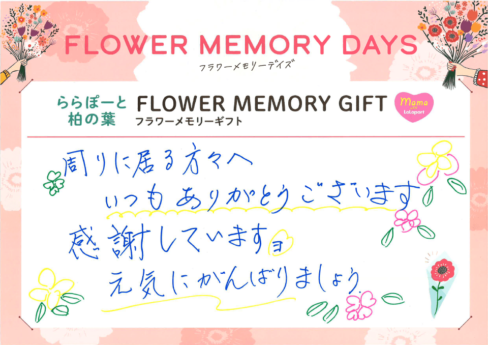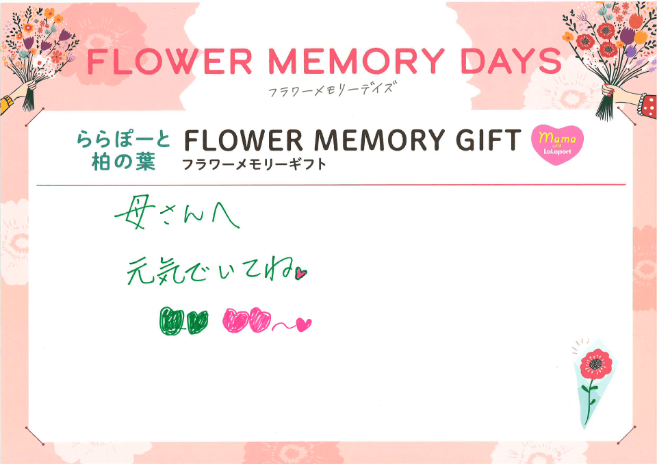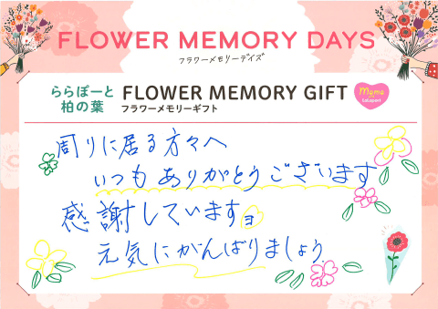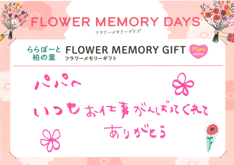 ※メッセージをタップすると拡大します ●以下の場合は当社の判断により掲載しない場合がございます。 ・第三者の権利を侵害していると思われる内容 ・法令または公序良俗に反すると思われる内容を含むもの ・その他当社が掲載見送りの判断をしたもの ●サイト掲載有無などのお問い合わせにはお答えができません。 協力:フラワーライフ振興協議会 / ジャパンフラワーグループ株式会社 ※掲載内容は予告なく変更する場合がございます。