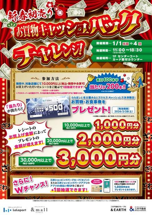 ✿新春初売り✿【対象店舗にて期間内に1万円以上お買上げいただいた方限定】お買物キャッシュバックチャレンジ抽選会 開催!!