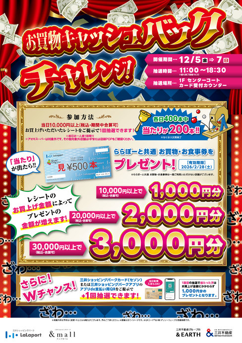 【対象店舗にて期間内に1万円以上お買上げいただいた方限定】お買物キャッシュバックチャレンジ抽選会 開催!!