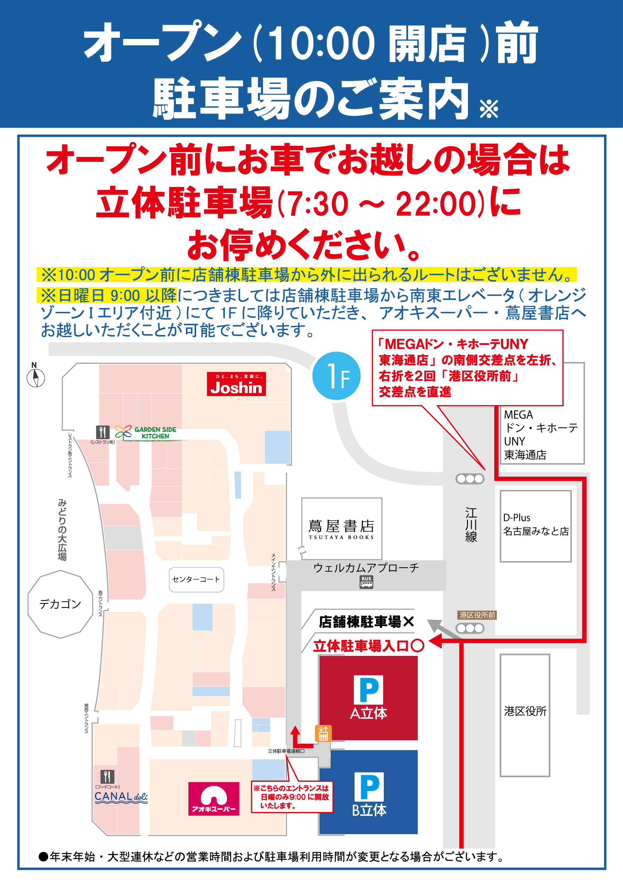 - ※江川線に出るには店舗棟駐車場又は北平面駐車場に停める必要があります。