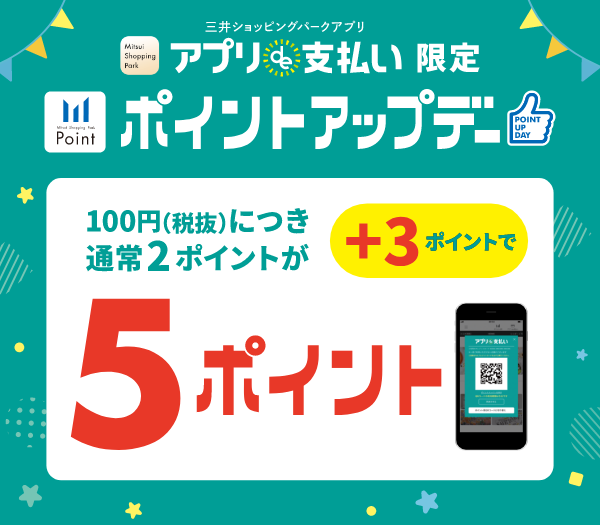 期間中、対象店舗にてアプリde支払いでお買物をしていただくと、三井ショッピングパークポイントを通常100円(税抜)につき2ポイント付与のところ、なんと5ポイント進呈!