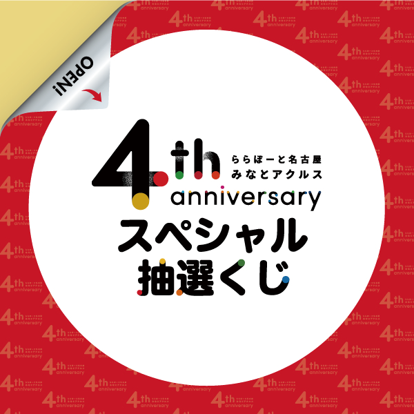 あふれだすありがとう。4th anniversary ららぽーと名古屋みなとアクルスはおかげさまで4周年!日頃よりご愛顧いただいている皆さまへあふれんばかりの感謝をお届け 9/16fri~10/2sun