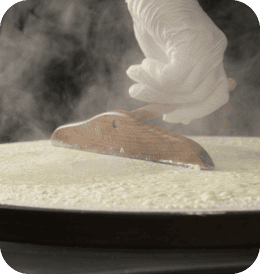 こだわりの製法で一枚一枚焼き上げたクレープ生地は、サクサク、もちもちと変化する食感をお楽しみいただけます。