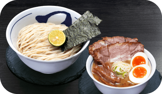 濃厚つけ麺:厳選した素材で作り上げた拘りの濃厚豚骨魚介スープと喉越しの良い特注麺をお召し上がりください。