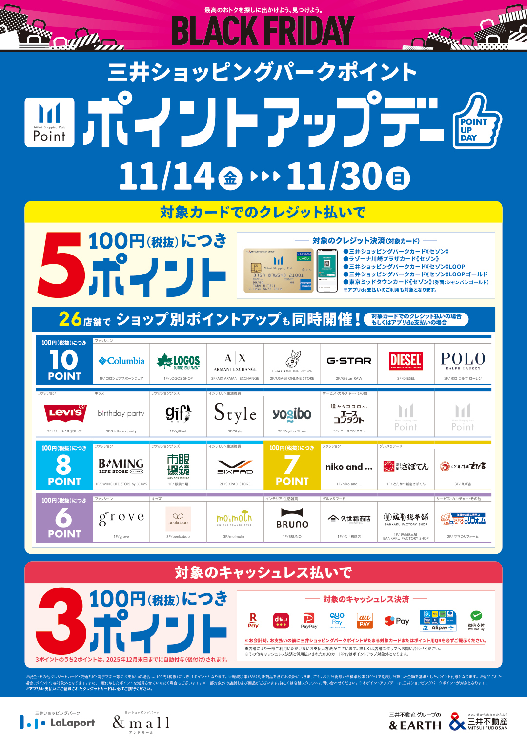 - 【BLACK FRIDAY】11/14(金)~11/30(日) 三井ショッピングパークポイント ポイントアップデー!
