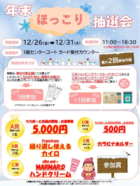 期間中、館内対象店舗にてお買上げいただいたレシートのご提示でご参加いただける【年末ほっこり抽選会】を開催いたします。