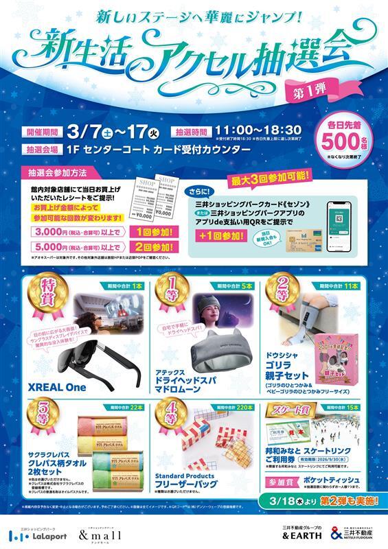 期間中、対象店舗にてお買上げいただいたレシートをご提示で、豪華賞品が当たる【新生活アクセル抽選会〈第一弾〉】を開催いたします!