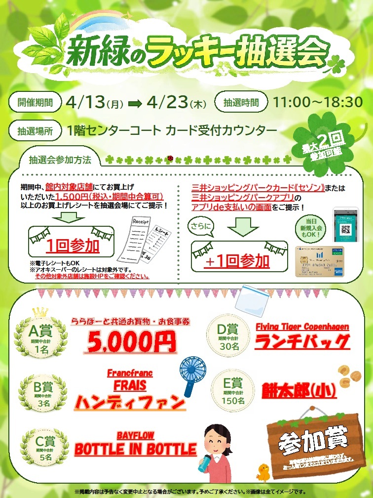 期間中、対象店舗にてお買物いただいた1,500円(税込・期間中合算可)以上のレシートのご提示で参加いただける、【新緑のラッキー抽選会】を開催いたします!