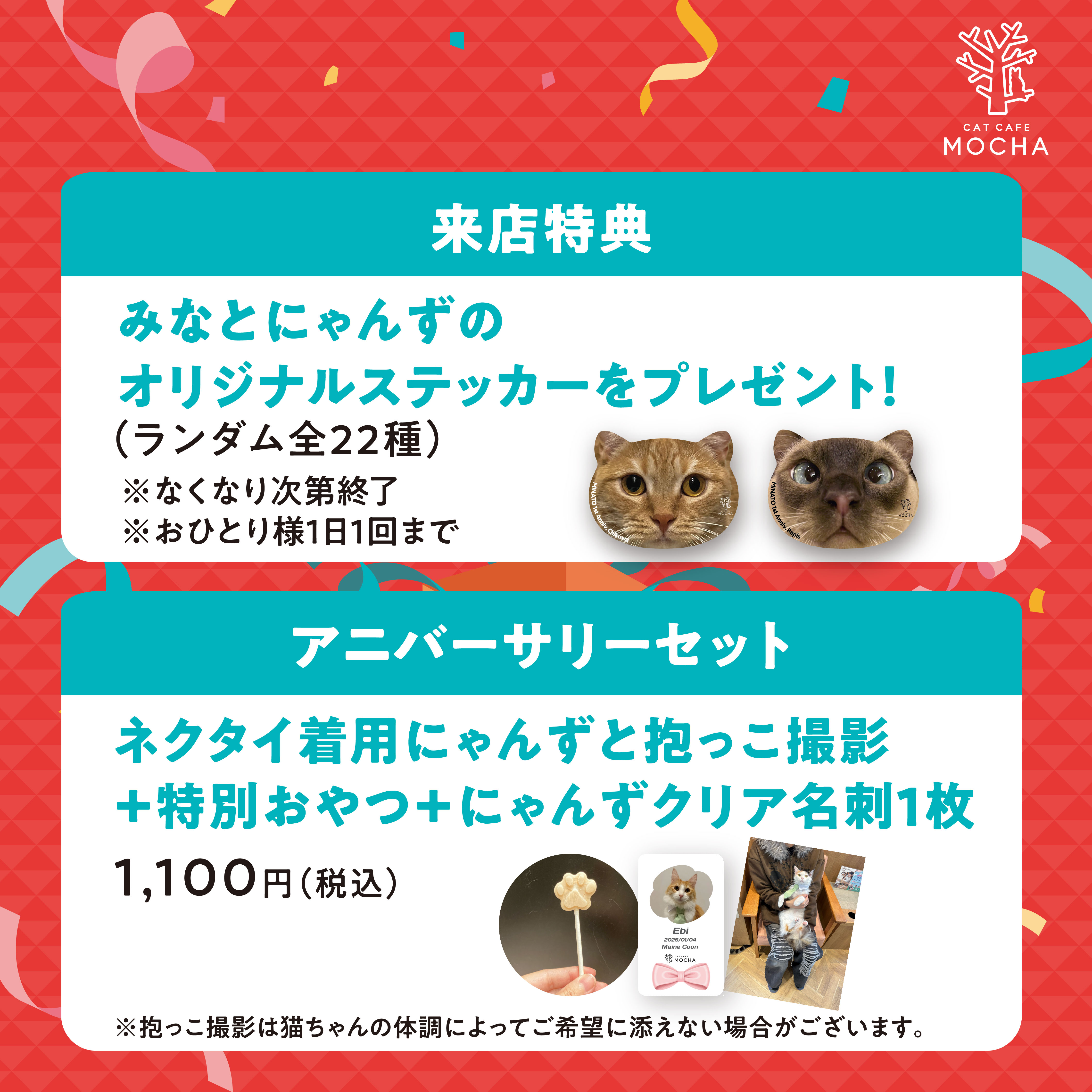 ネクタイ着用にゃんずと抱っこ撮影+特別おやつ+ランダムにゃんずクリア名刺1枚