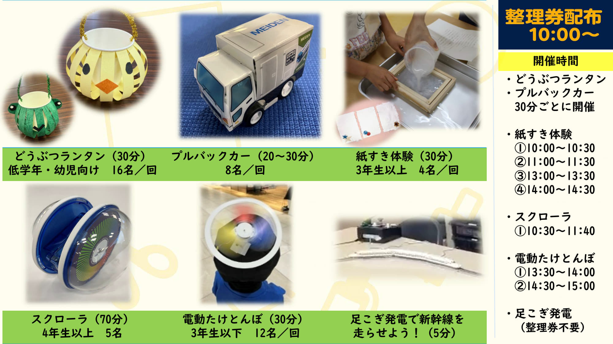 ランタンづくりやモーターを使った工作、紙すき体験、足こぎ発電など、