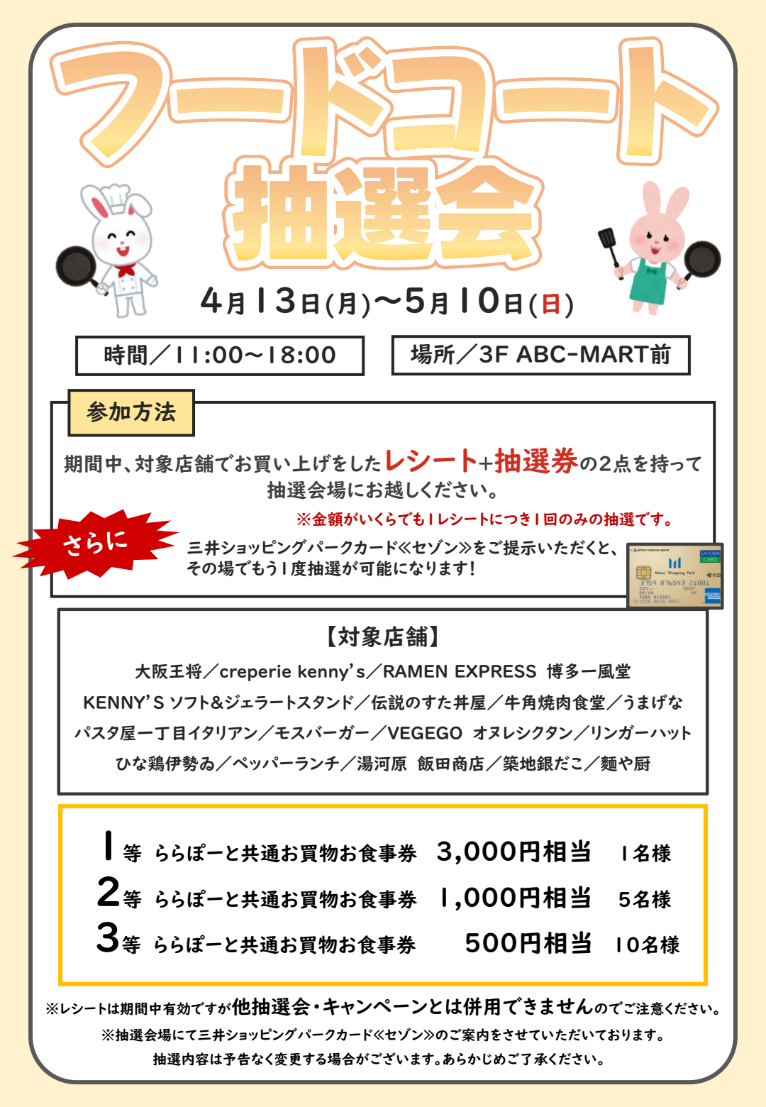 4/13(月)~5/10(日)の期間中、対象店舗でお買い上げをしたレシートと抽選券の2点をもって3F ABC-MART前の抽選会場にお越しいただくと、豪華景品が当たる抽選会にご参加いただけます!