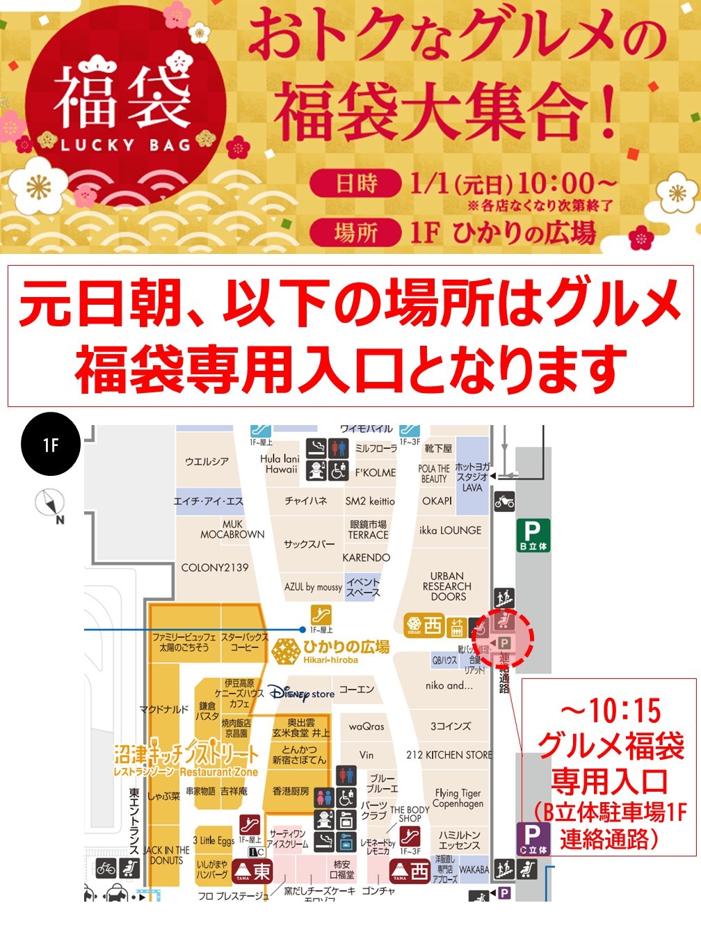 グルメ福袋以外の各店舗へ入店される場合は、~10:15頃までB立体駐車場1F入口からはお入りいただけませんのでご注意ください。