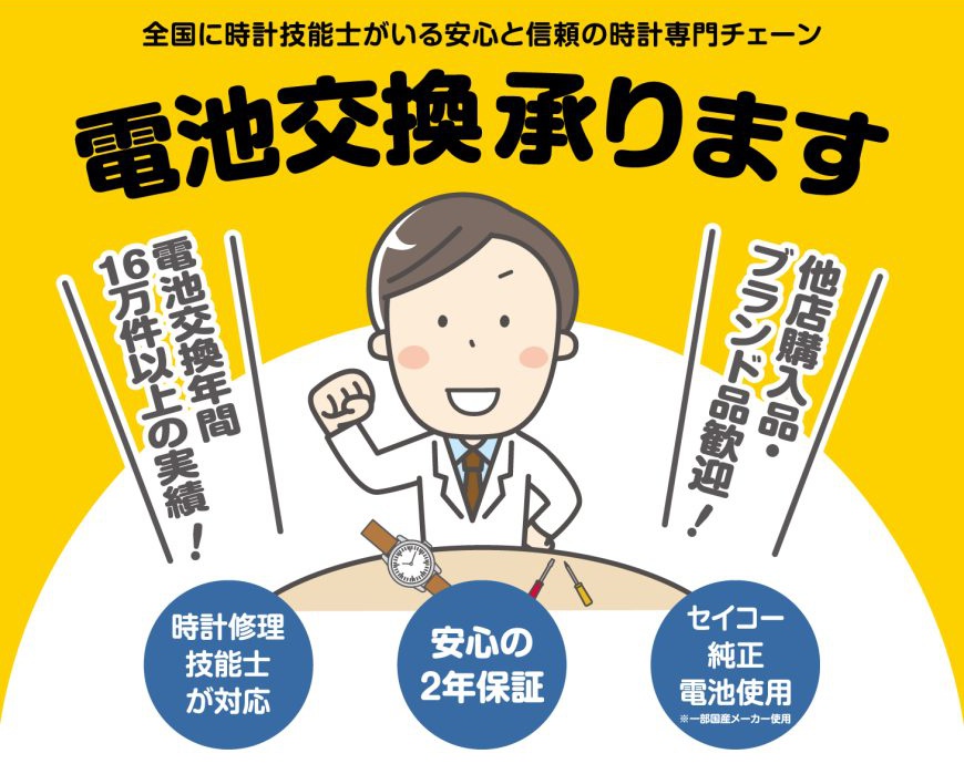 ※お時計の形状や状態によっては店頭での電池交換ができない物もございます。