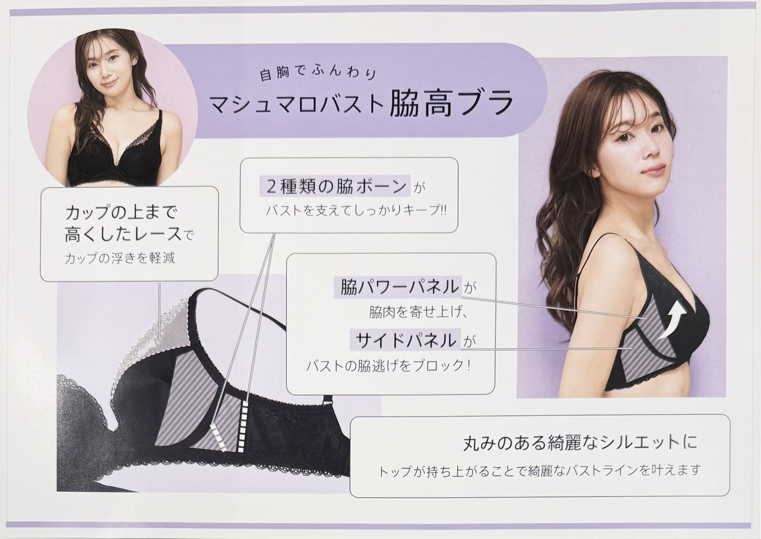マシュマロバスト脇高ブラは、ソフトでナチュラルな丸胸を叶えるブラジャー。