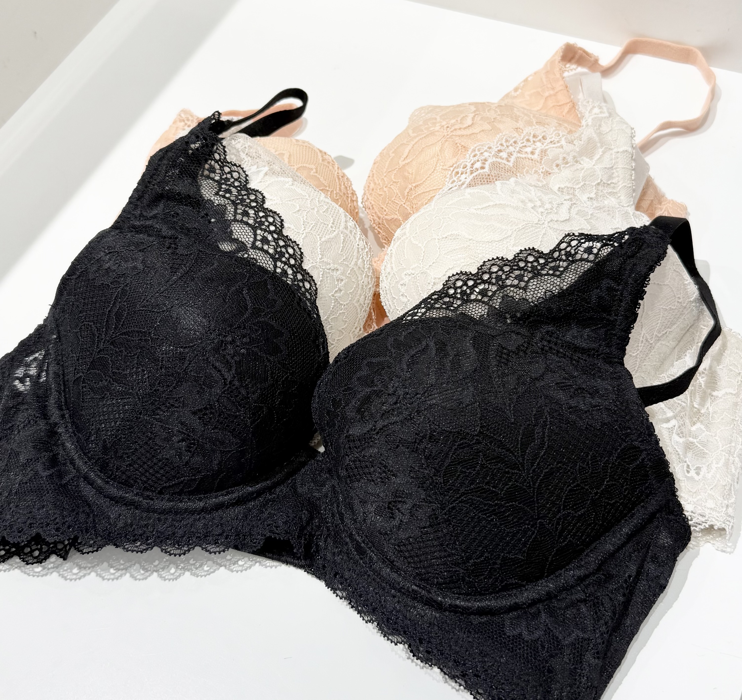 やわらかめのウレタンカップがバストに優しくフィットし、高い位置まで覆うレースでカップの浮きを抑えながら、自然な丸胸の寄せ感を演出。
