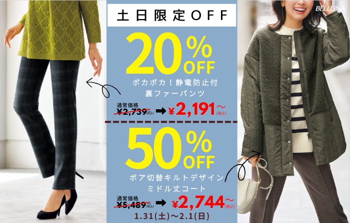 今週土日は「ボア切替キルトデザインミドル丈コート」が50%OFF、「ポカポカ!静電防止付裏ファーパンツ」が20%OFFで買えるチャンス!