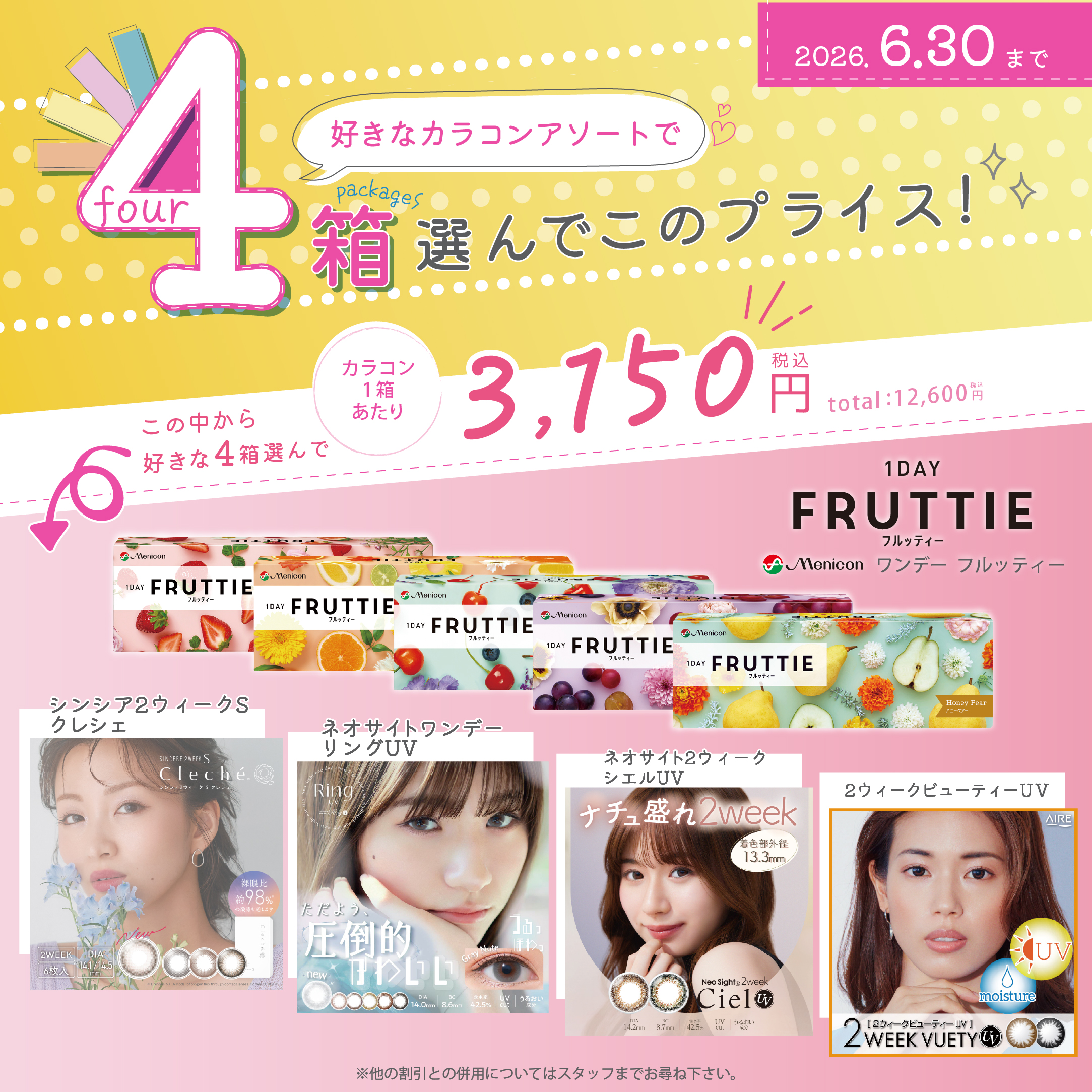 対象レンズ4箱を同時購入すると割引価格にてお買い求めいただけます。