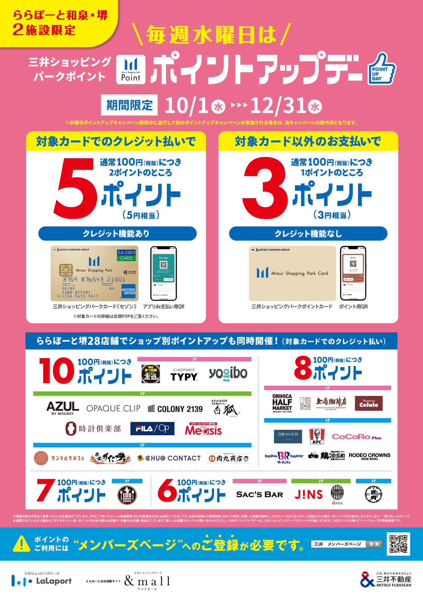 10/1(水)~12/31(水)の期間、毎週水曜日はおトクな三井ショッピングパークポイント ポイントアップデー!