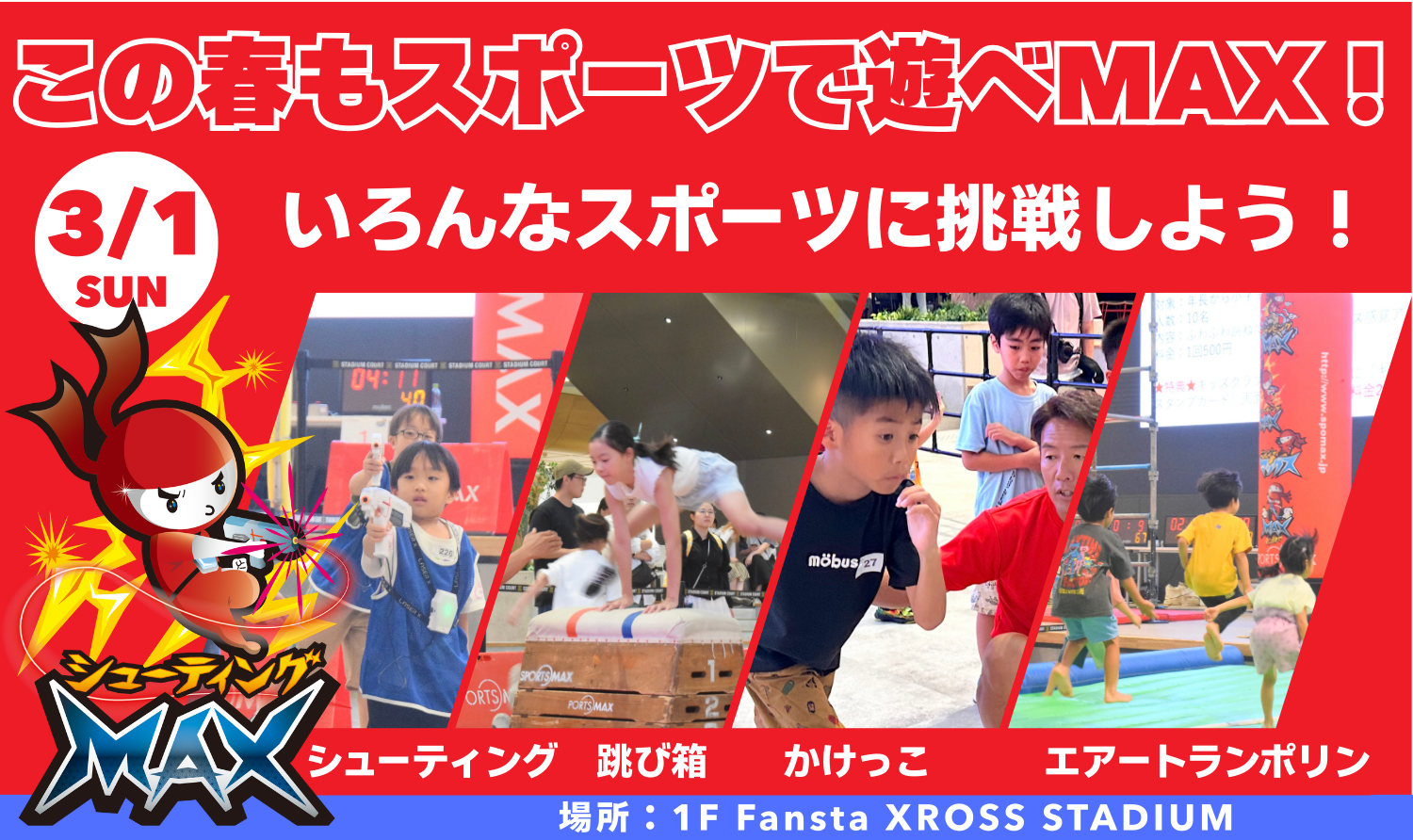 この春も「スポーツで遊べMAX!」。跳び箱日本一決定戦ジャンピングMAXをはじめ、かけっこ、跳び箱、シューティングMAX、エアトランポリンなど、子どもから大人まで楽しめるスポーツ体験を開催します。