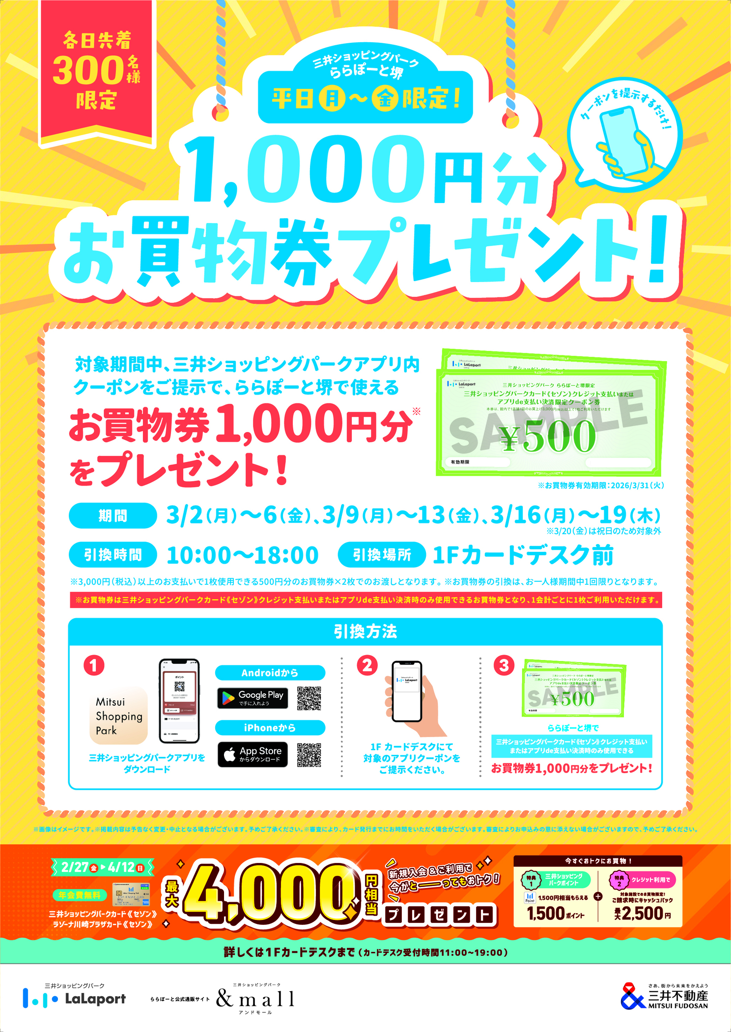 三井ショッピングパークアプリのクーポンをご提示で、ららぽーと堺で使える「お買物券1,000円分」をプレゼント!