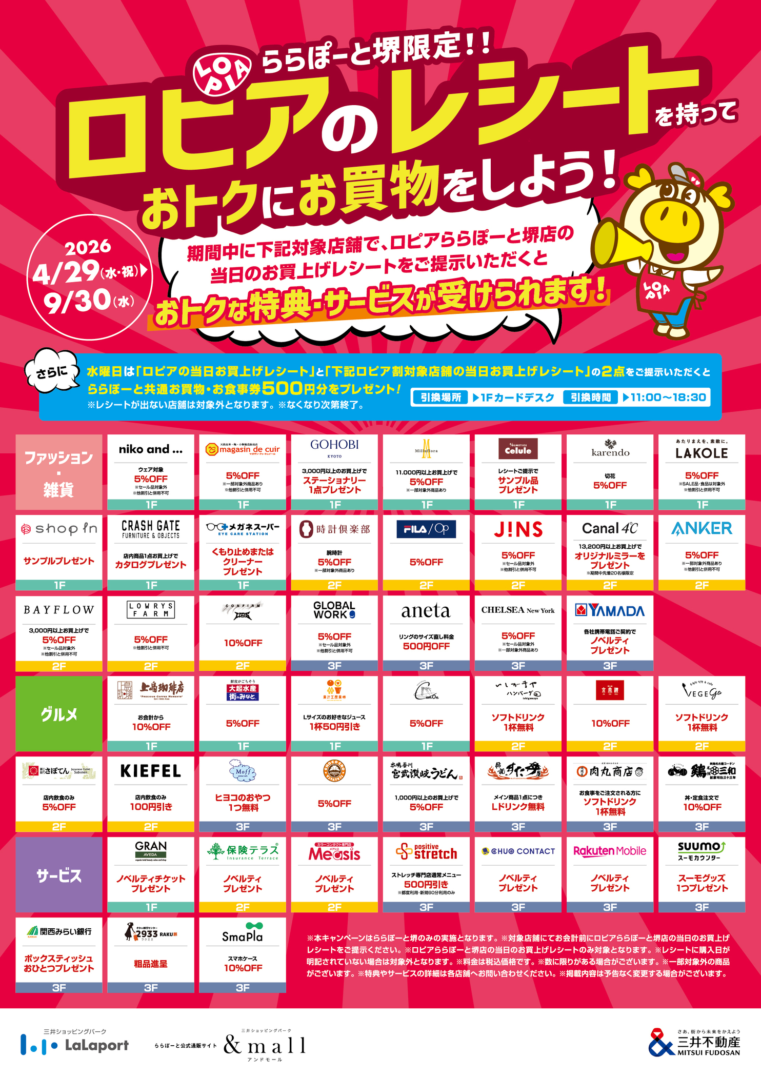 期間中、対象店舗で、ロピアららぽ―と堺店の当日利用分のレシートをご提示いただくとおトクな特典・サービスが受けられます!