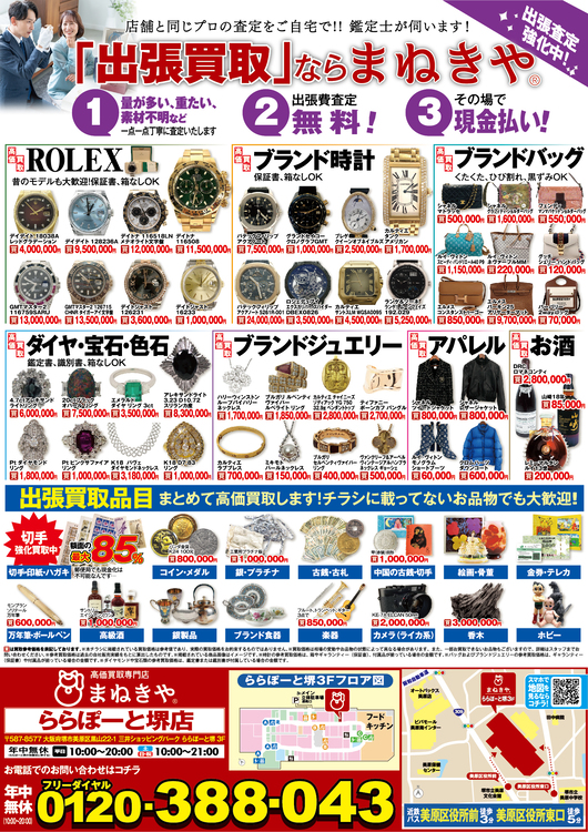- 主な取引品:金、貴金属、ダイヤ、宝石、ROLEX、ブランド時計、ブランドジュエリー、ブランドアパレル、お酒、古銭、切手、カメラなど 取り扱いブランド:シャネル、ルイヴィトン、エルメス、ブルガリなど