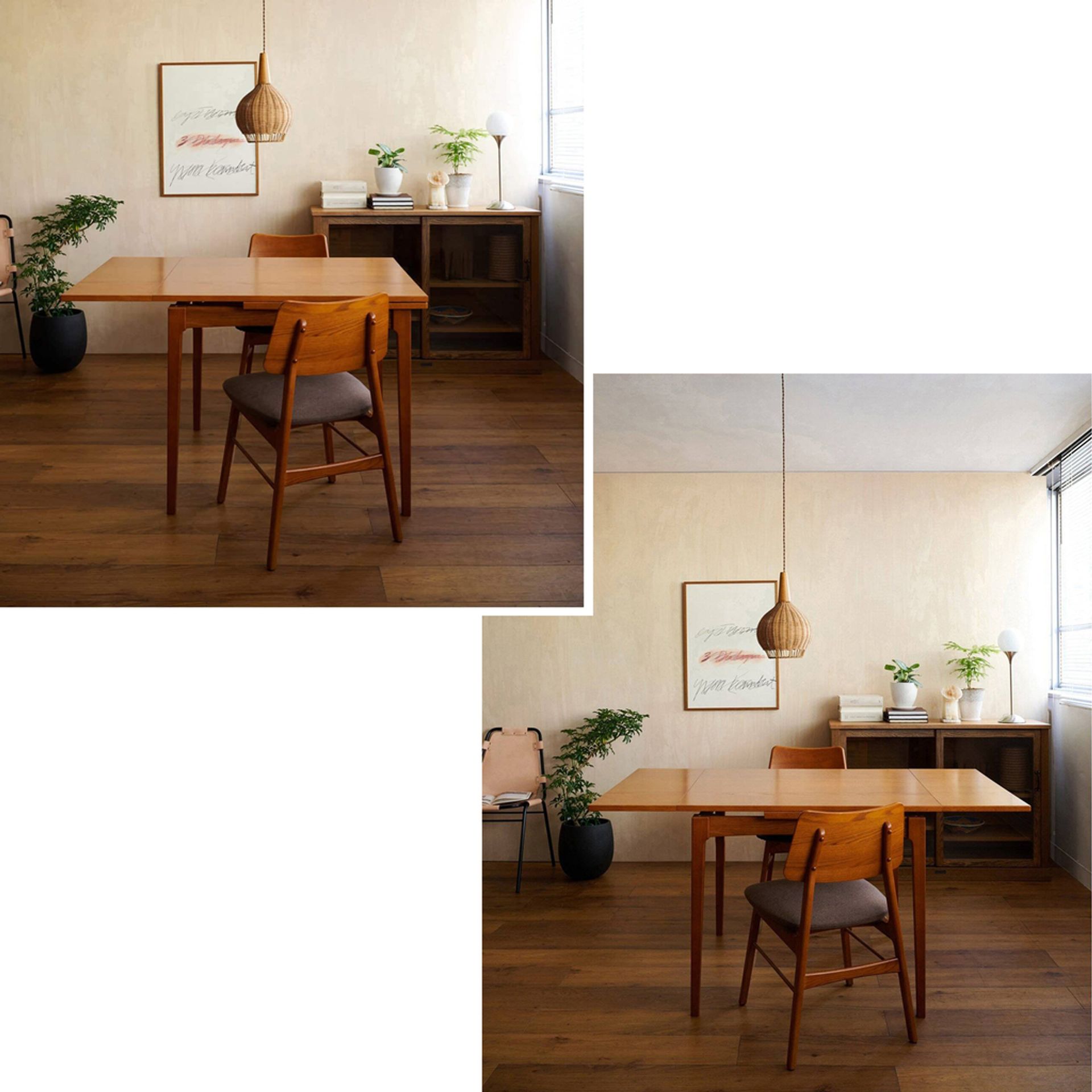 天板下に収納された伸長板をスライドさせるだけで簡単にサイズ変更できるので