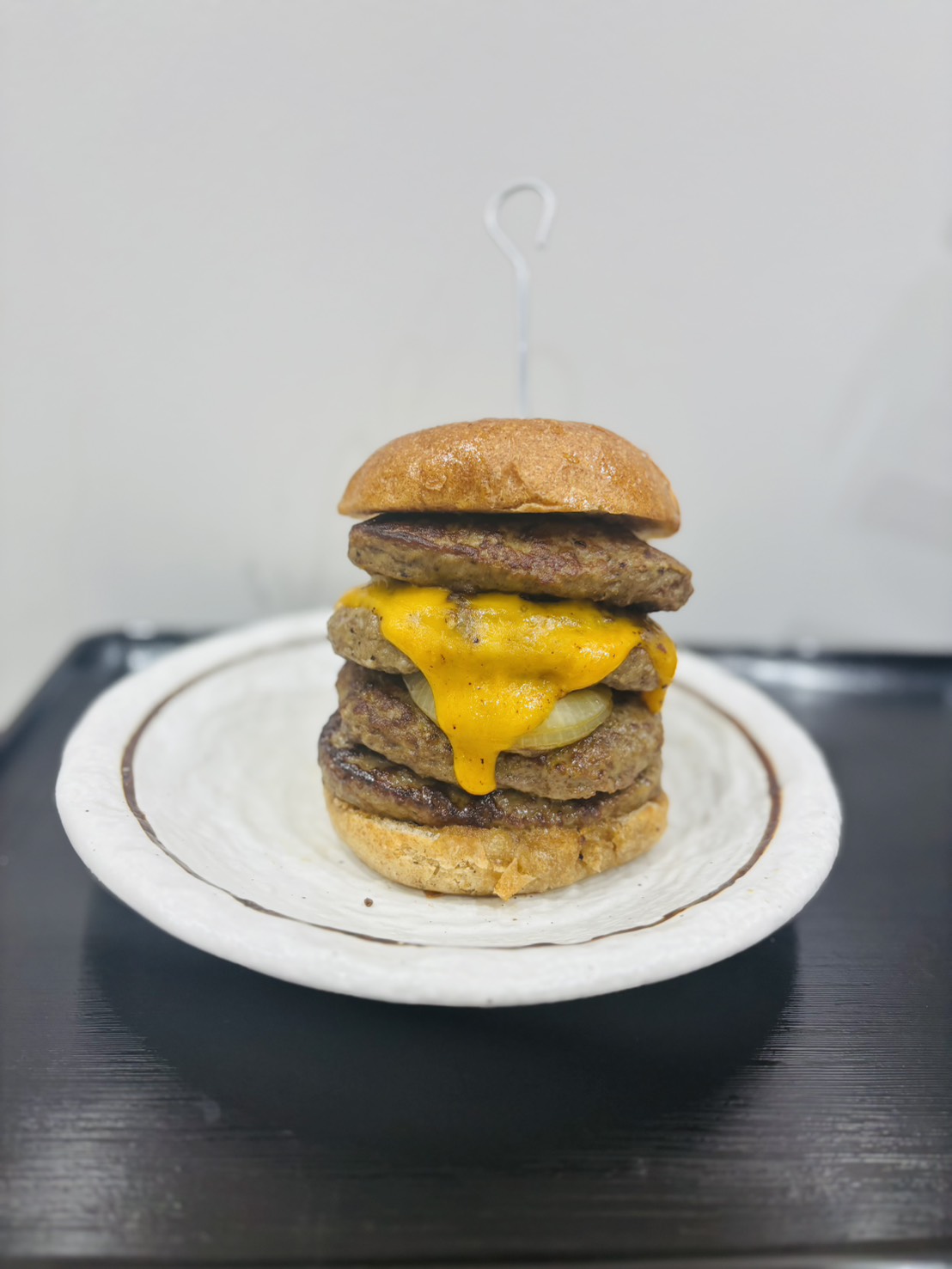 お肉を贅沢に4枚使用した、圧倒的なボリューム感のスペシャルバーガー。ニンニク醤油・塩・わさびの3種で味の変化を楽しみながら、自分好みの食べ方でお召し上がりください。