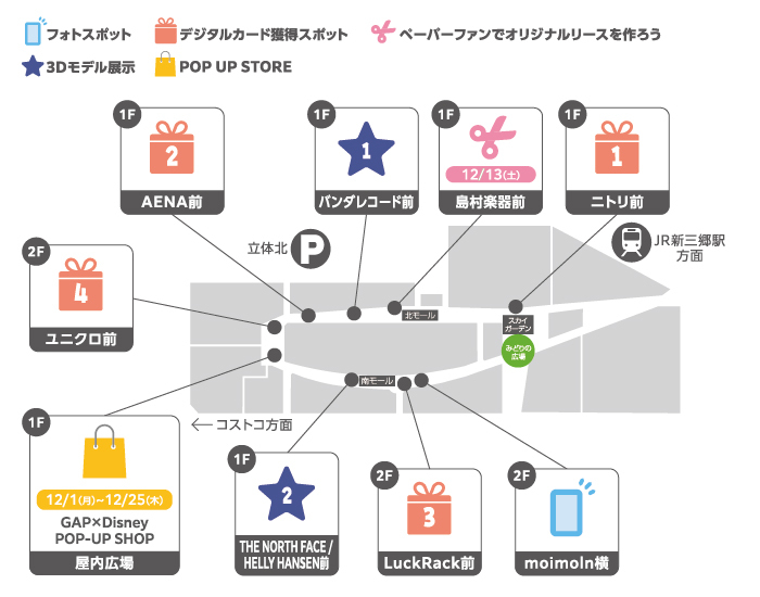 【場所】北モール1階 バンダレコード前/南モール1階 THE NORTH FACE/HELLY HANSEN前