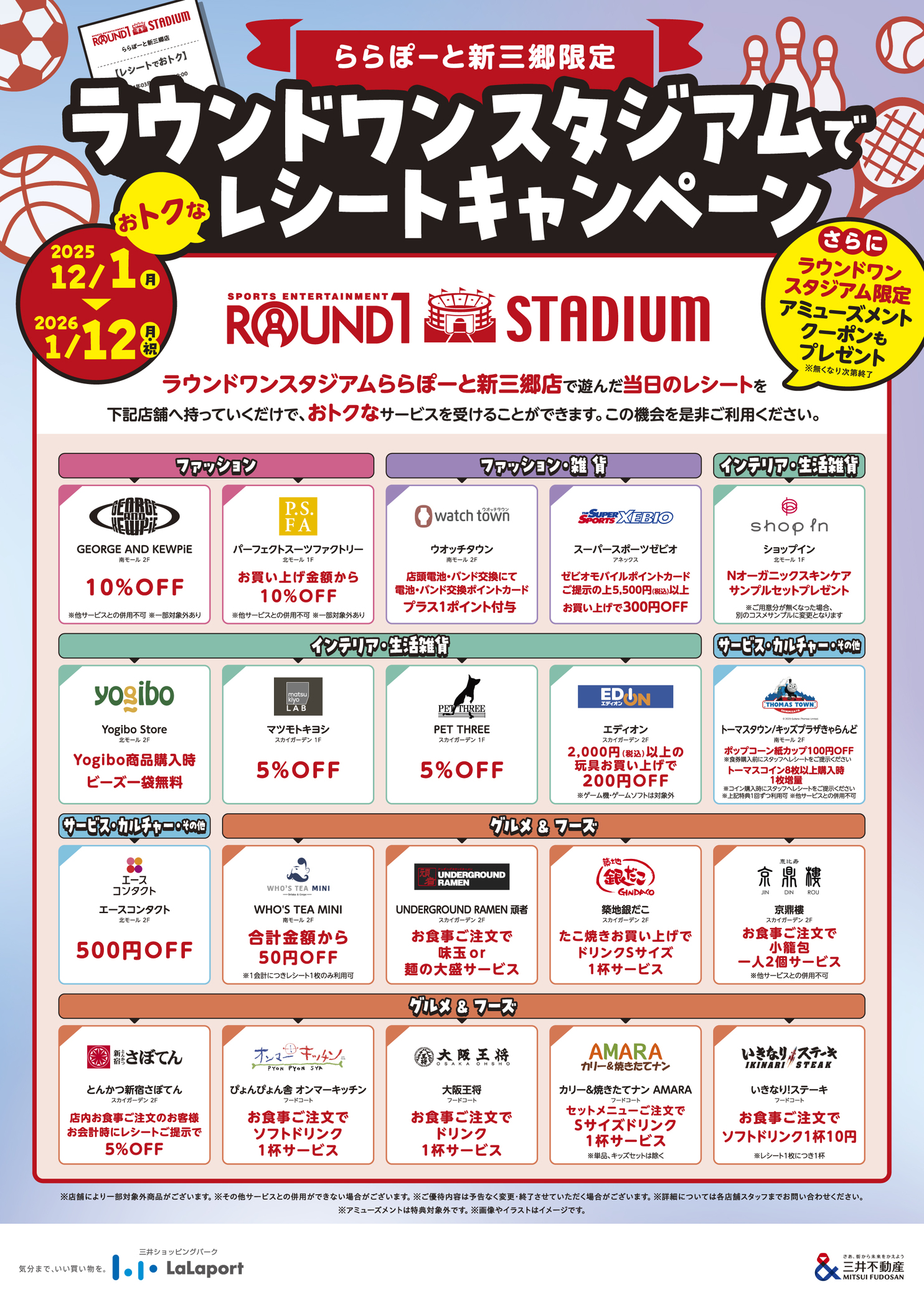 ラウンドワンスタジアムららぽーと新三郷店で遊んだ当日のレシートのご提示で、対象店舗にておトクなサービスを受けられる!