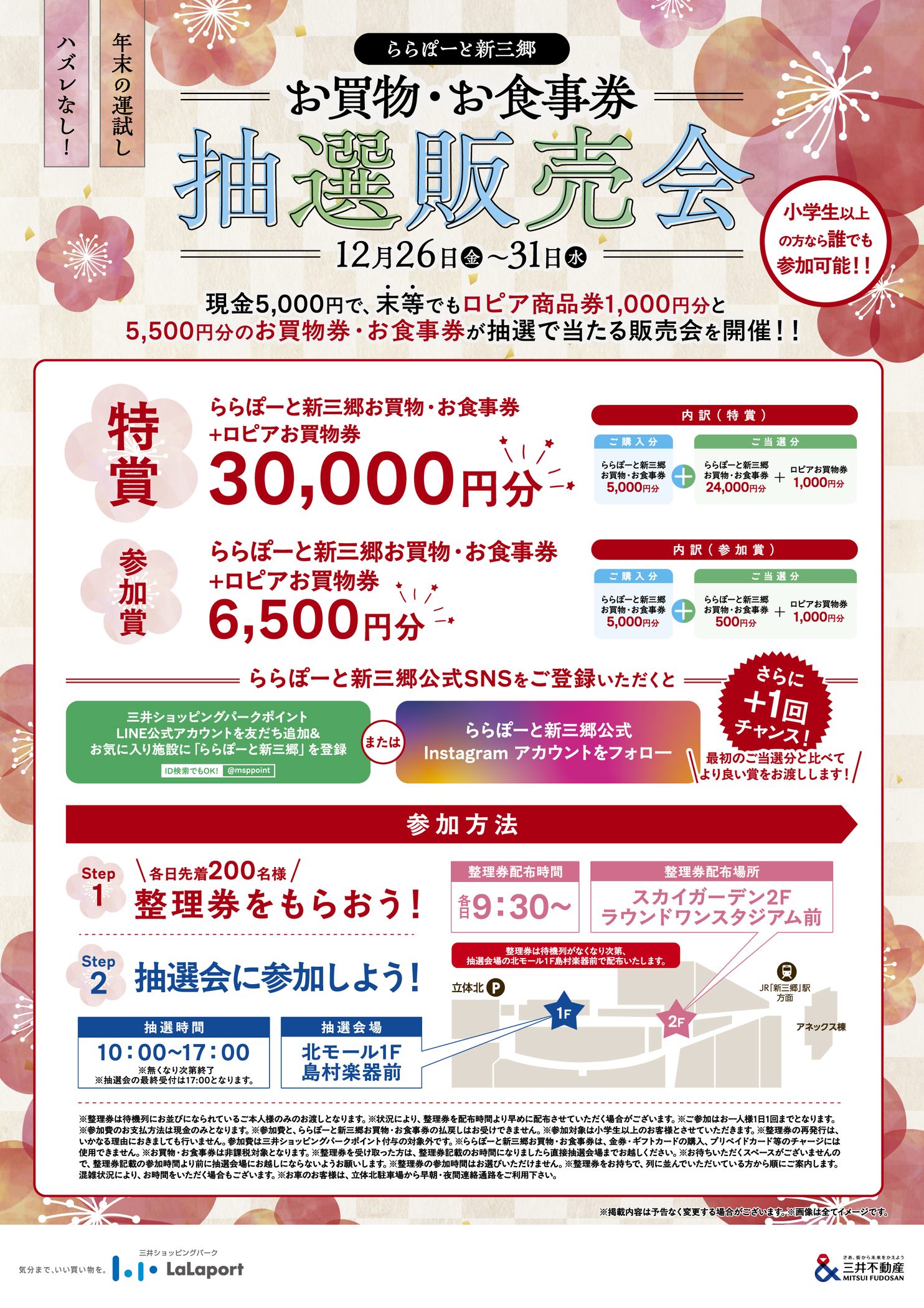 ハズレなし!現金5,000円で、末等でもロピア商品券1,000円分と5,500円分のららぽーと新三郷お買物券・お食事券が抽選で当たる販売会を開催!!