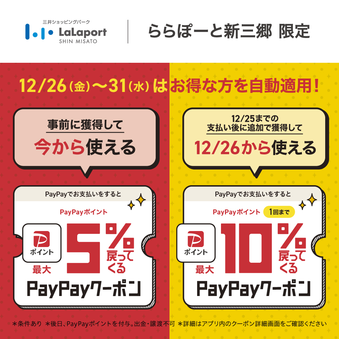 更に、12/12(金)~12/25(木)の期間、ららぽーと新三郷の対象店舗にて「PayPay5%戻ってくるクーポン」をご利用いただくと、最大10%分のPayPayポイントが後日付与されるクーポンを配布いたします。