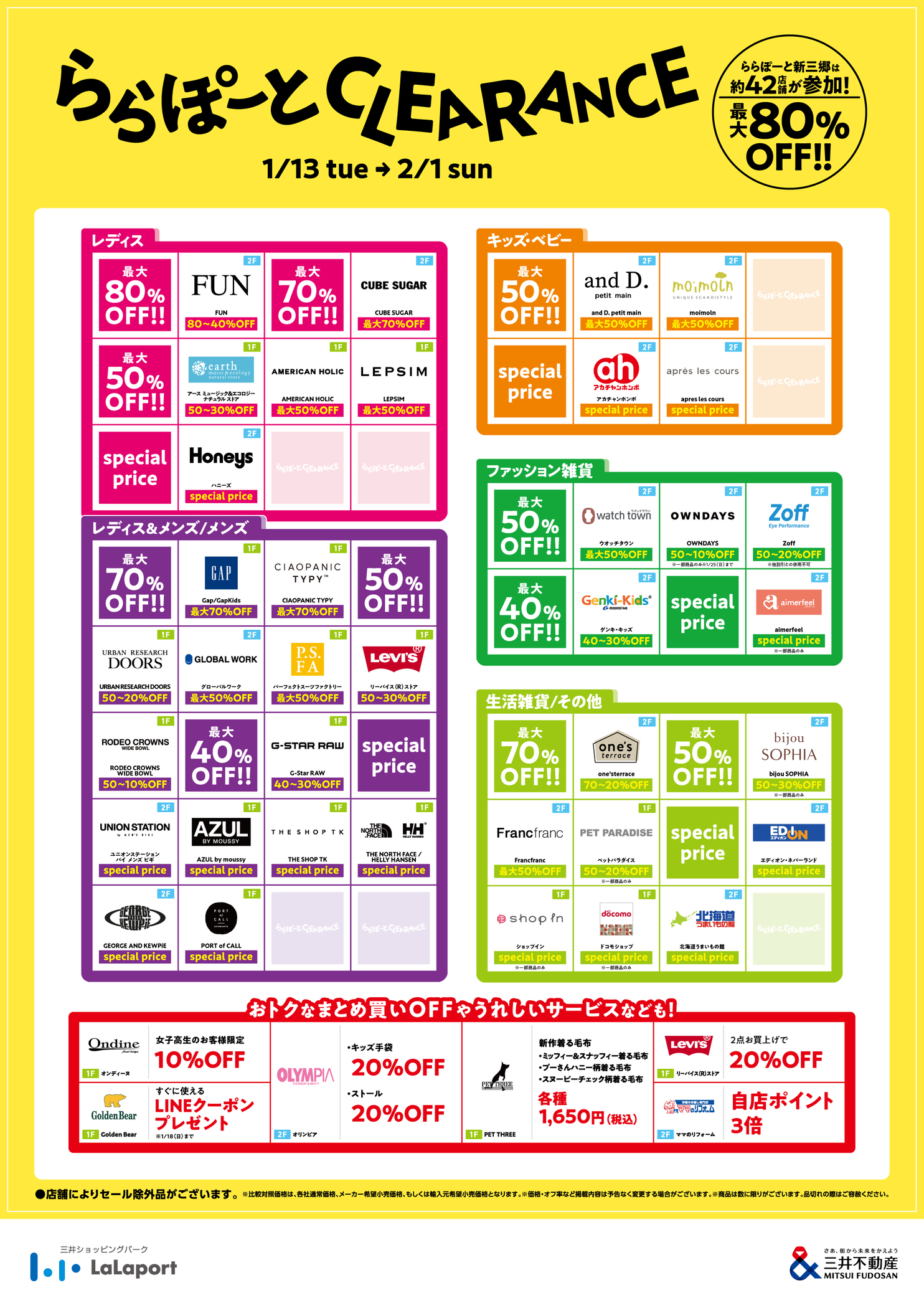 1/13(火)~2/1(日)の期間、約 40 店舗が参加するららぽーとクリアランスを開催!