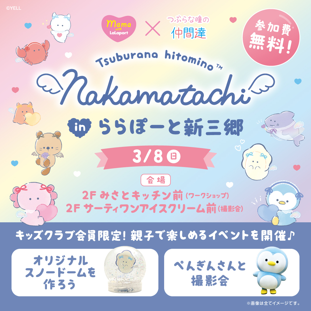 SNSを中心に人気急上昇中の「つぶらな瞳の仲間達」シリーズと『ママwithららぽーと』のコラボインベントを開催!かわいいキャラクター達とイベントを楽しもう!