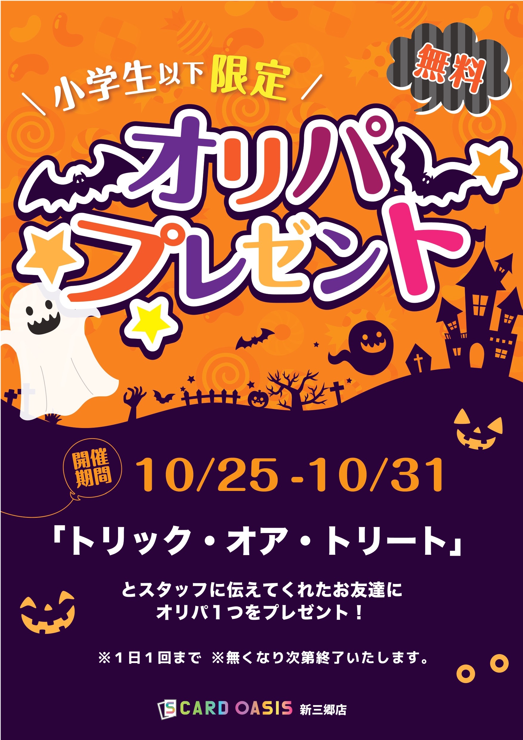 S CARD OASISでは、10/25~31まで小学生以下のお客様を対象にハロウィンイベントを開催します!