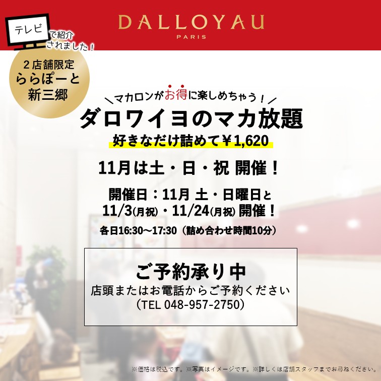 - 【ダロワイヨ】11月マカロン詰め放題イベント「マカ放題」開催のお知らせ