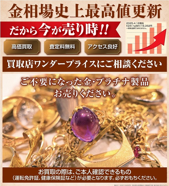 金、プラチナなどの貴金属のお買取りならワンダープライスへ!インゴットや喜平、コインなど貴金属なら