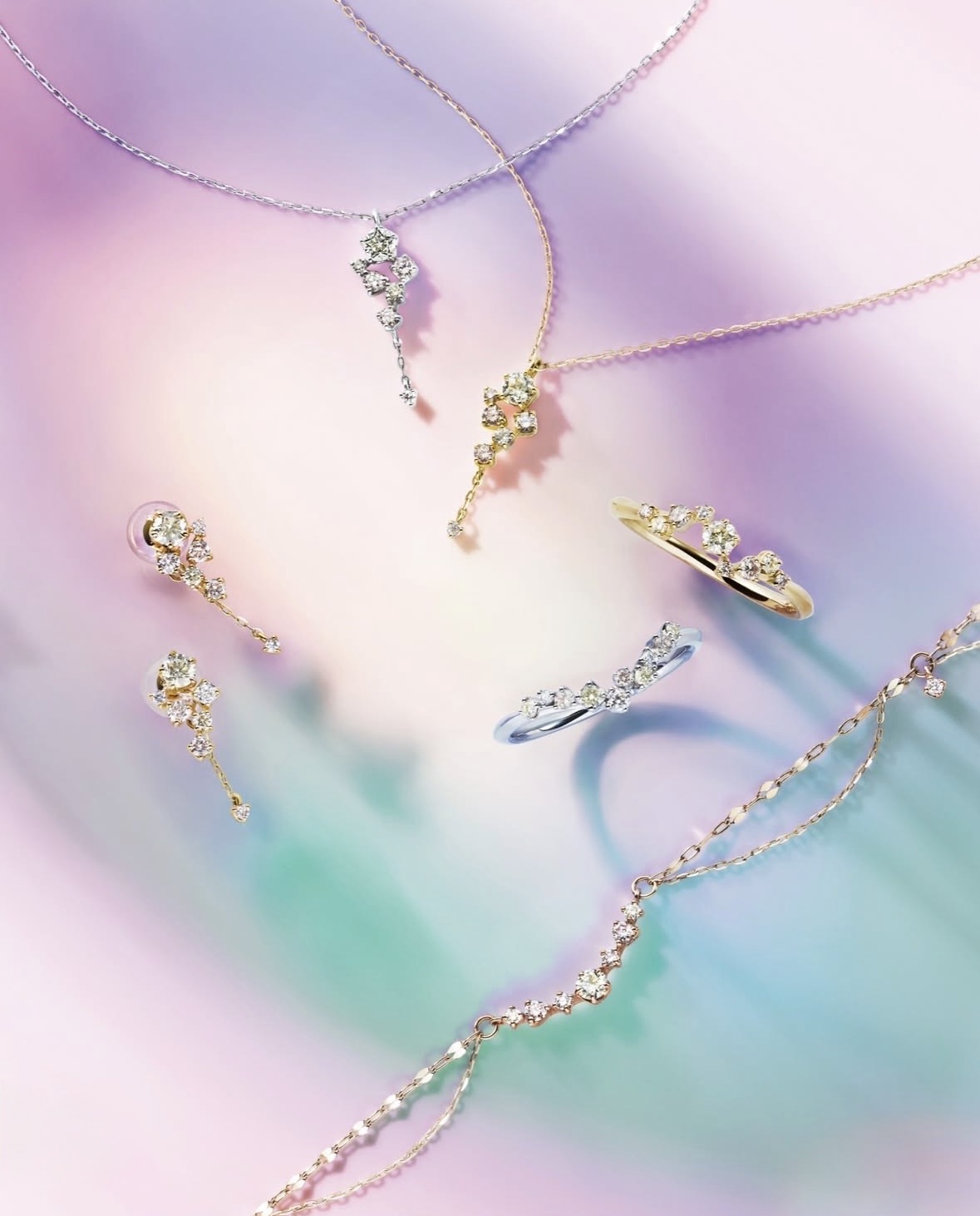 ダイヤモンドの色味を3種類組み合わせ、1粒1粒の大きさにもこだわって配置を調整し絶妙なバランスに仕上げました。
