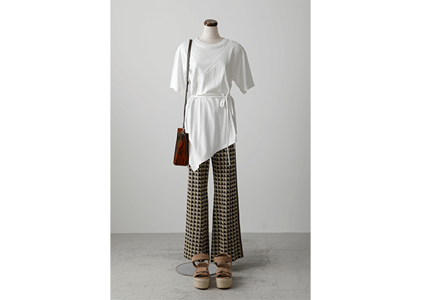ルーズなシルエットながらウエストをすっきりと見せてくれるトップスは、まぶしいほどの清潔感が特徴のピュアホワイトを選んで。ブランドオリジナルの幾何学柄が特徴のジャカードニットパンツと合わせれば、心地よい春の個性派スタイルが完成!