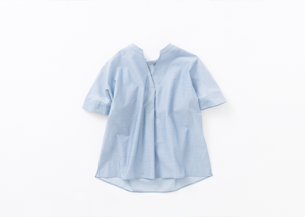 さらりと着るだけでサマになる、独特なシルエットと端正な襟元のデザインが特徴のブラウス。気分まですっと癒されそうな、気持ちの良い柔らかなブルーも目を引きます。春から夏にぴったりな適度に透け感のある軽やかな素材使いもポイント。