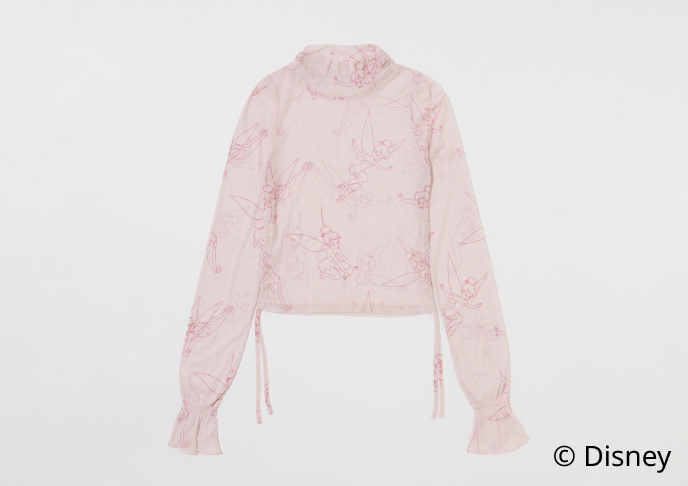 ティンカーベルの総柄が華やかなシアートップス。程よいボリュームのキャンディースリーブが女性らしさを引き立てます。コードでシルエットを変えられる2WAY仕様で、カジュアルにもきれいめにも活躍する万能アイテムです。