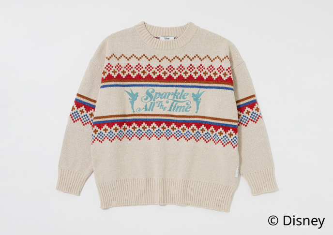 フェアアイル調の柄にティンカーベルとピーターパンを刺繍したニット。柔らかな肉厚素材にラメ糸の輝きを加え、冬の装いに華やかさをプラスします。ユニセックスなゆったりシルエットで、デイリーにも特別な日にもおすすめです。