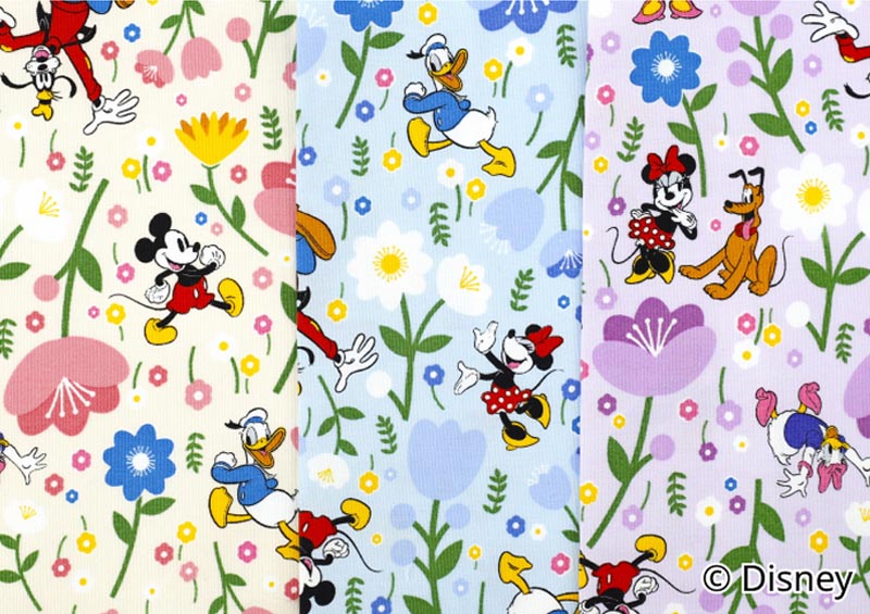ユザワヤオリジナル柄!ミッキー&フレンズのプリント生地です。ナチュラル・サックス・パープルの3色展開。