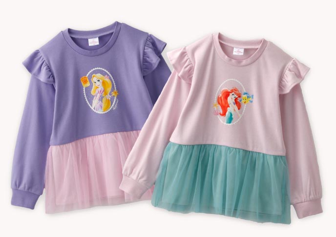 プリンセス・ミニー、ラプンツェル・アリエルのデザインがかわいいプルオーバー。80~130cmのサイズ展開で姉妹・友達とおソロコーデもおすすめ!