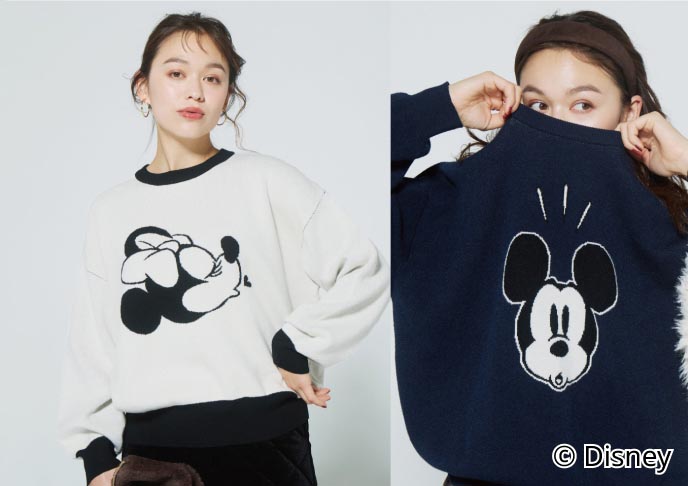 クリスマスシーズンにぴったりの、ミッキーマウス&ミニーマウスのニット。落ち着いたネイビーとやさしいアイボリーの2色展開で、大人かわいい印象に。ホリデーの特別なひとときにも寄り添う上品なデザインです。