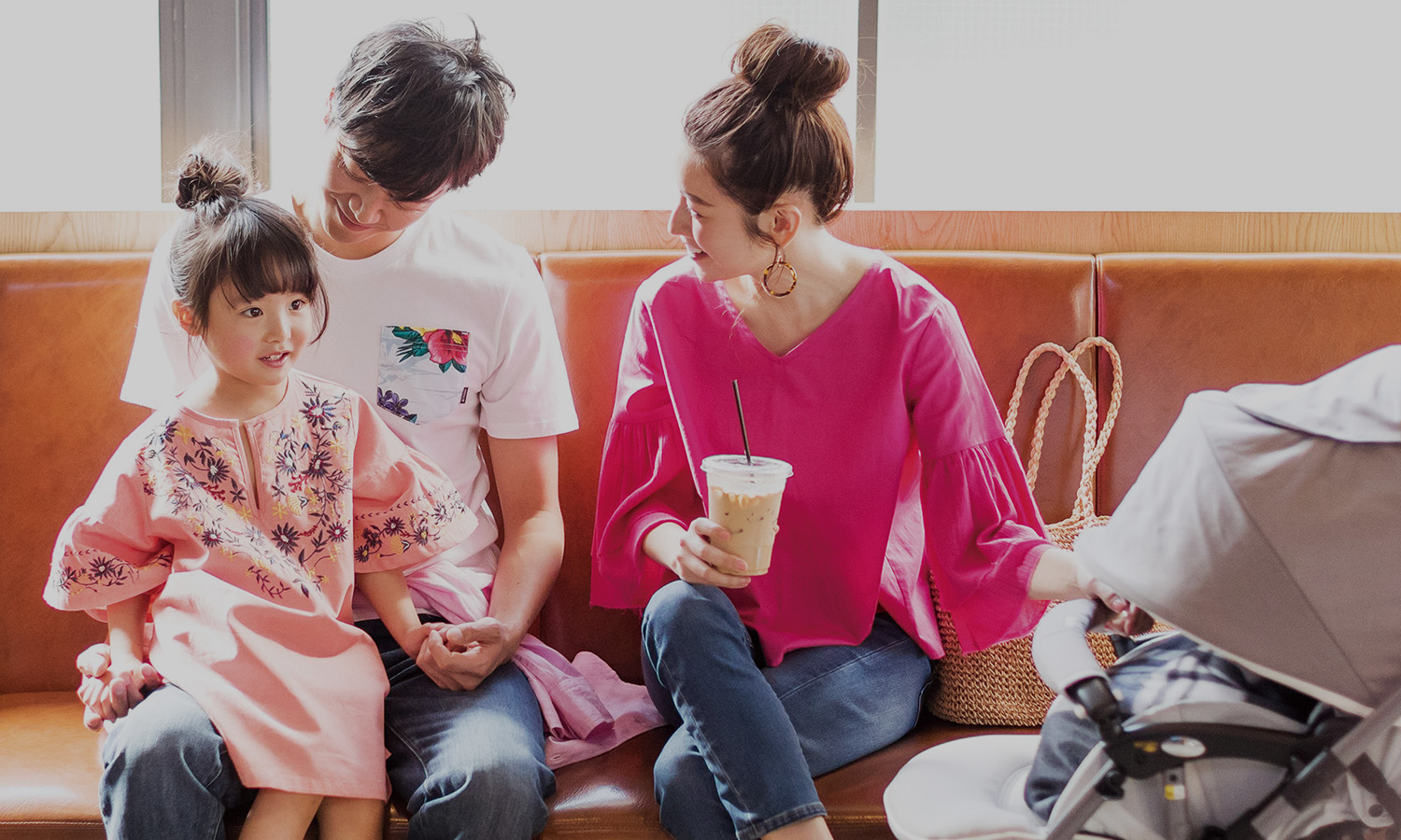 腰に巻いたピンクのシャツで、ママ&キッズと色をリンク。