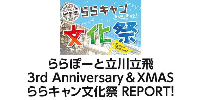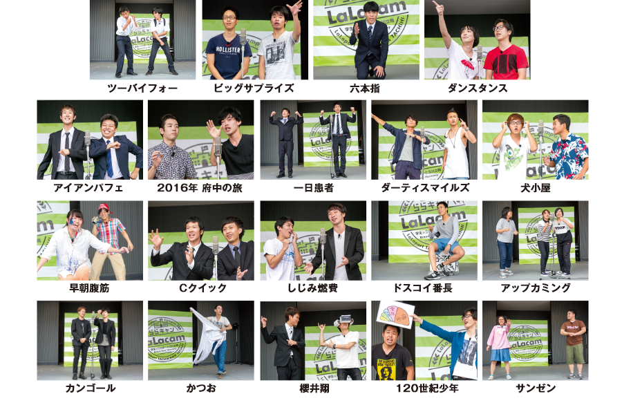 第3回となった今回は、9月18日(日)に「LaLacam vol.3 学生お笑いLIVE‘16」と題し、笑いを愛する学生芸人19組が、コントや漫才を熱演。会場を笑いの渦に巻き込んでくれました。最後にはSPECIAL GUESTとして人気漫才コンビ「ナイツ」が登場し、大いに盛り上げてくれました。また出演者の学生たちにアドバイスを含め、暖かいメッセージもいただきました!今後も様々なプログラムで学生の「夢の披露の場」を提供していく「ららキャン」。次回もどうぞご期待ください!