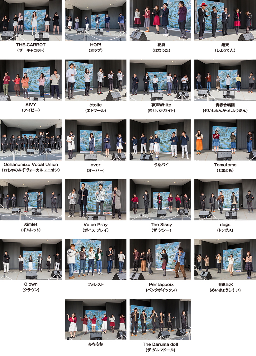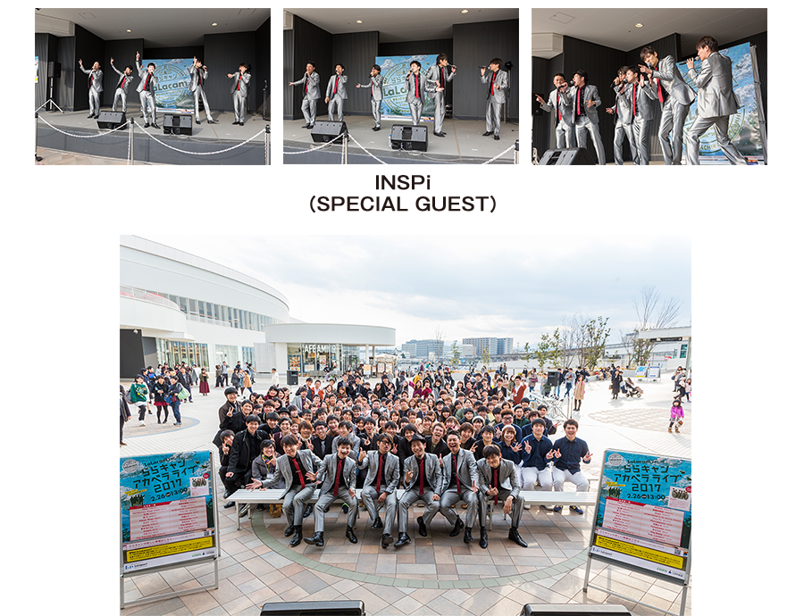 第5回となった今回は、「LaLacam vol.5 ららキャンアカペラライブ2017」と題し、アカペラを日頃から練習している学生22組!総勢133名という過去最大出演者数の学生たちが、会場でいろんな楽曲を披露していただきました。ライブの最後にはスペシャルゲストとして「INSPi」が登場し会場をさらに盛り上げてくれました。今後も様々なプログラムで学生の「夢の披露の場」を提供してまいります。「ららキャン」にどうぞご期待ください!