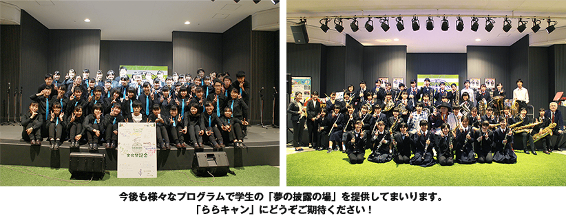 第2回となった今回は、6月19日(日)に「ららキャンLIVE’16」と題し、日頃音楽活動に励む学生達の中から厳選された6組が、若さ溢れる熱いステージを魅せてくれました! ライブの最後にはGUEST BANDとして「Swimy」が登場。会場を大いに盛り上げてくれました。 今後も様々なプログラムで学生の「夢の披露の場」を提供していく「ららキャン」。 次回vol.3は9月18日(日)を予定しております。どうぞご期待ください!